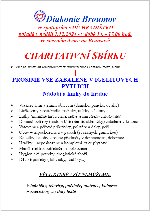 V neděli 1. prosince 2024 se uskuteční charitativní sbírka pro Diakonii Broumov – jediná v letošním roce. Věci můžete ukládat ve sběrném dvoře na Brunšově v době od 14 do 17 hodin.