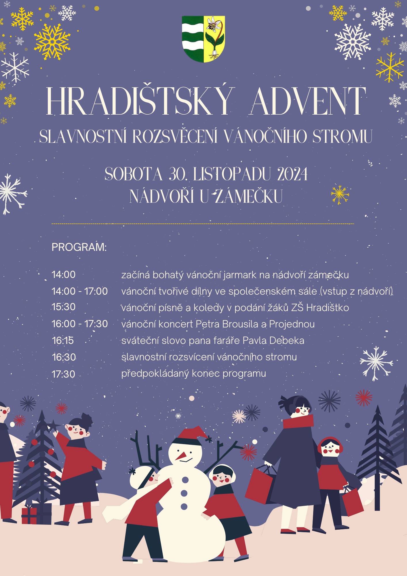 Srdečně vás zveme na Hradištský advent! Slavnostní rozsvěcení vánočního stromu se bude konat na nádvoří u zámku, a to v sobotu 30. listopadu 2024 od 14 hodin. Můžete se těšit na bohatý jarmark, výtvarné dílny pro děti, vystoupení žáků ZŠ, koncert a mnoho dalšího. Plakát zde.