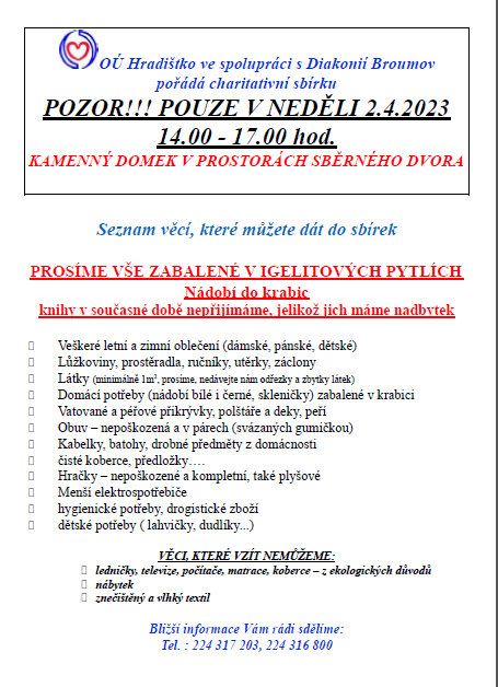 V neděli 2. dubna 2023 se uskuteční charitativní sbírka pro Diakonii Broumov. Věci můžete ukládat ve sběrném dvoře na Brunšově v době od 14 do 17 hodin.