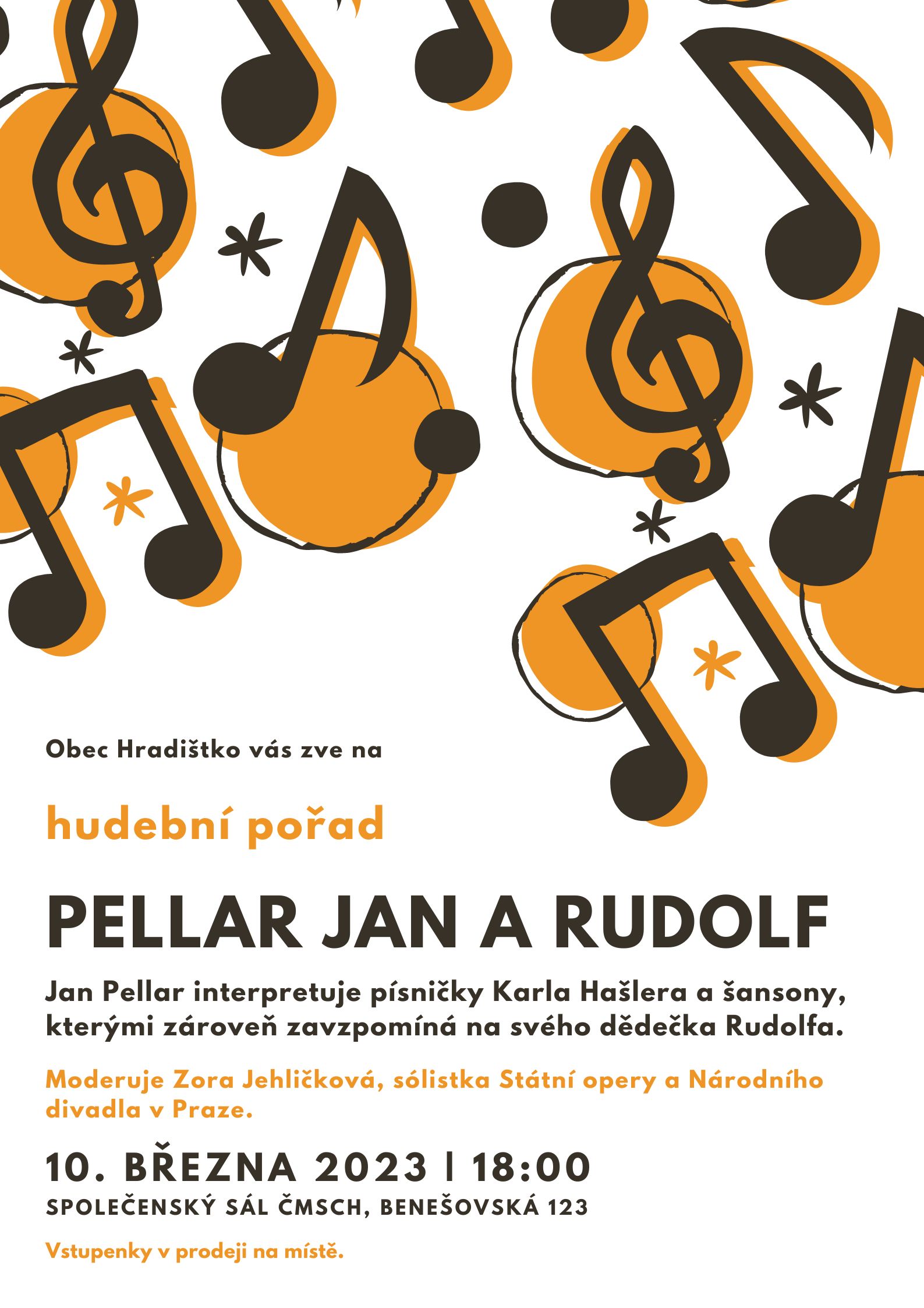 Srdečně Vás zveme na hudební pořad “Pellar Jan a Rudolf”, který se koná v pátek 10. března 2023 v 18 hodin ve společenském sále ČMSCH. Jan Pellar interpretuje písničky Karla Hašlera a šansony, kterými zároveň zavzpomíná na svého dědečka Rudolfa. Moderuje Zora Jehličková, sólistka Státní opery a Národního divadla v Praze. Vstupenky v prodeji na místě. Plakát zde.