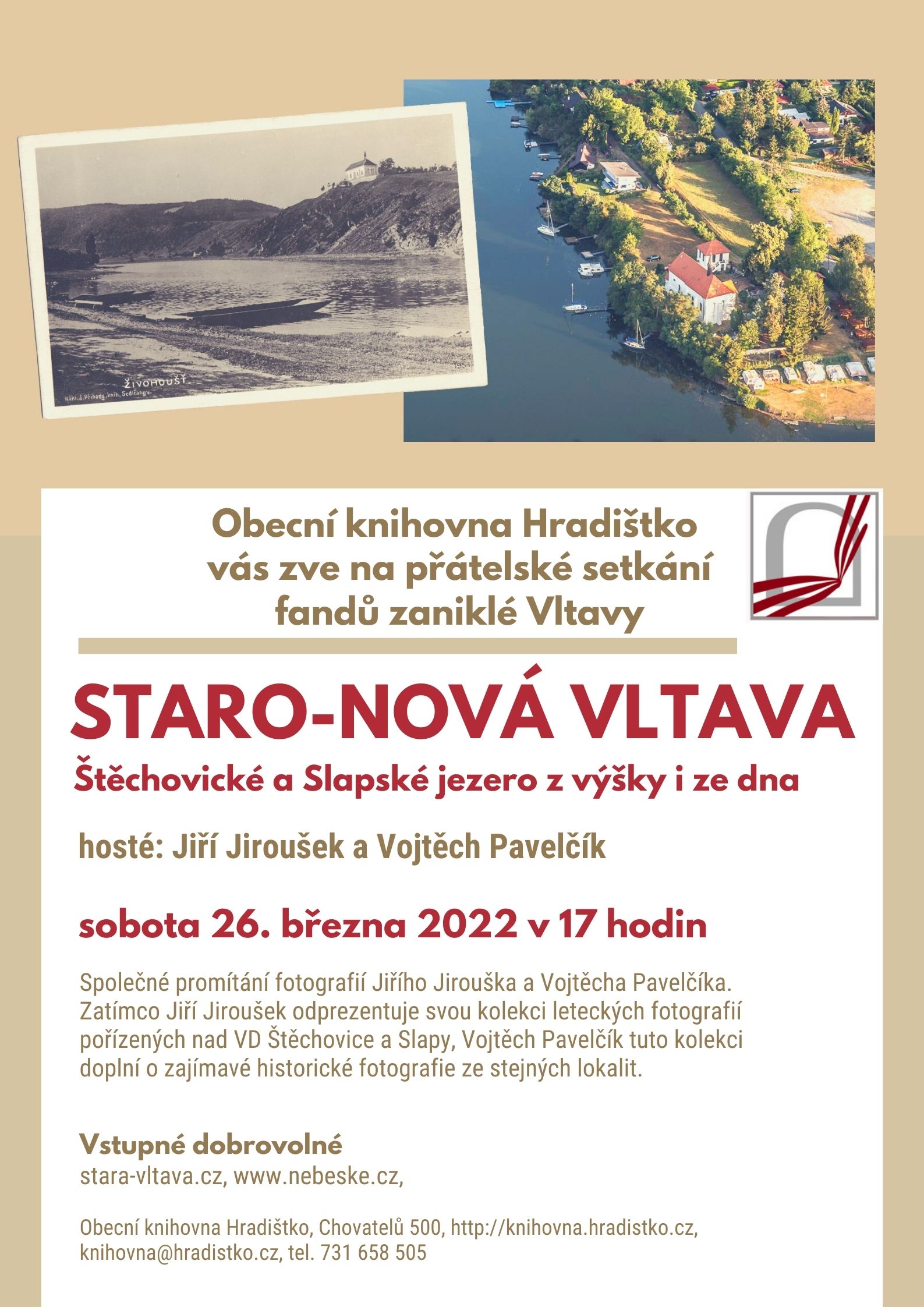 Zveme vás na přátelské setkání fandů zaniklé Vltavy v sobotu 26. března 2022 od 17 hodin v knihovně. Společné promítání fotografií Jiřího Jirouška a Vojtěcha Pavelčíka. Zatímco Jiří Jiroušek odprezentuje svou kolekci leteckých fotografií pořízených nad VD Štěchovice a Slapy, Vojtěch Pavelčík tuto kolekci doplní o zajímavé historické fotografie ze stejných lokalit. Plakát zde.