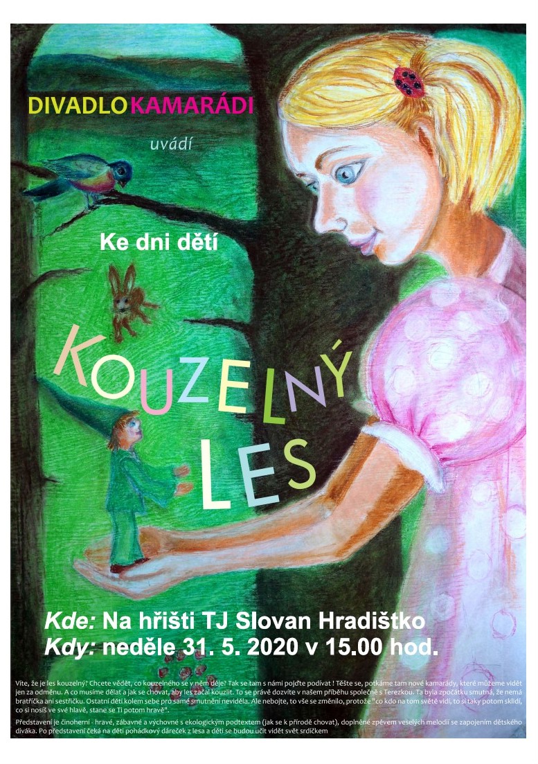 Zveme všechny děti, rodiče a prarodiče na divadelní představení Kouzelný les, které se koná u příležitosti Mezinárodního dne dětí v neděli 31. května v 15 hodin na fotbalovém hřišti TJ Slovan Hradištko. Plakát zde.