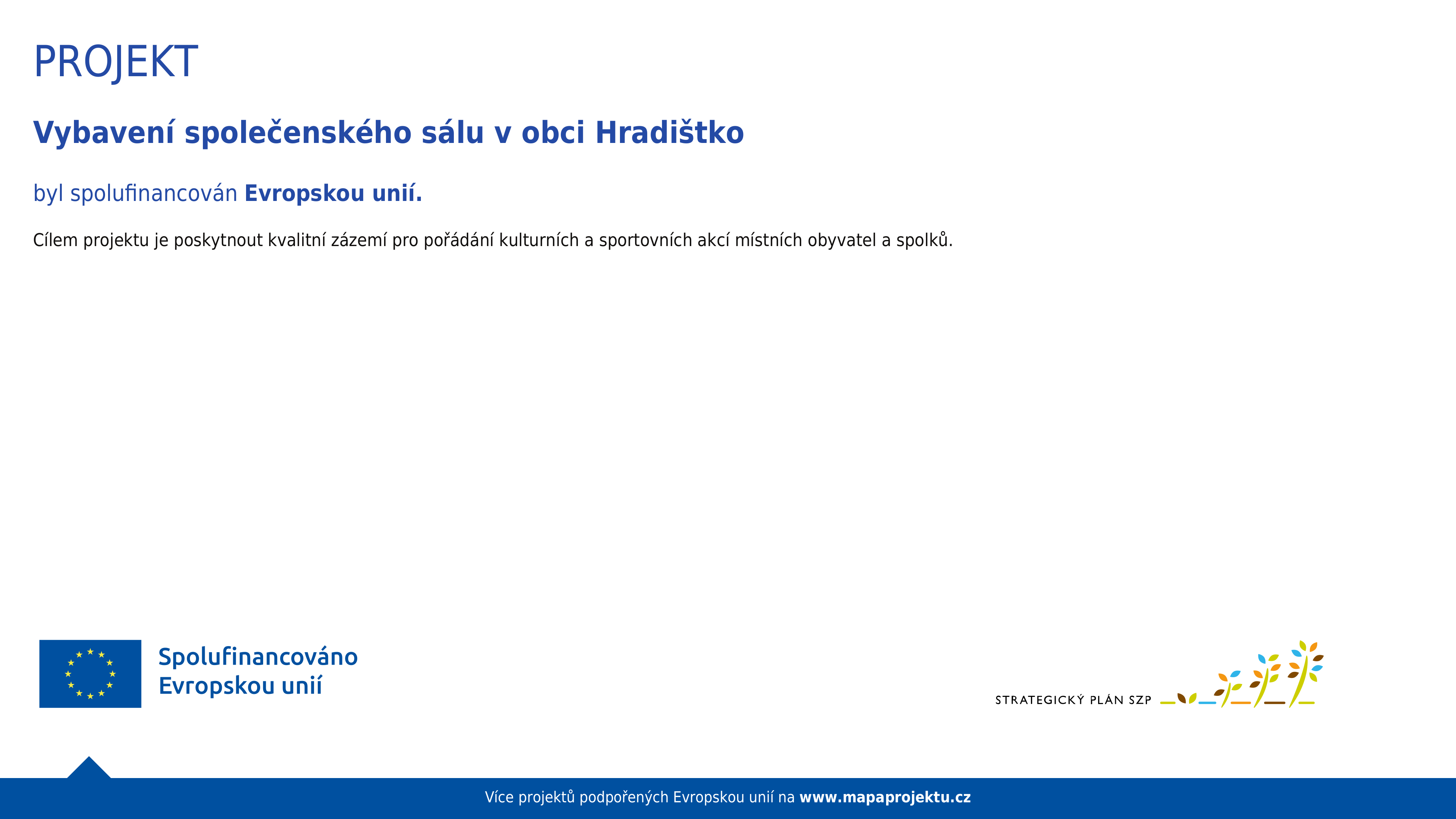 Předmětem projektu je vybavení do sálu, které rozšíří možnosti využití sálu pro organizaci kulturních a společenských aktivit. Cílem projektu je poskytnout kvalitní zázemí pro pořádání kulturních a sportovních akcí místních obyvatel a spolků. Přínosem projektu budou lepší podmínky pro aktivity, které už v sále v současné době probíhají, a zároveň se vytvoří podmínky pro konání nových aktivit.