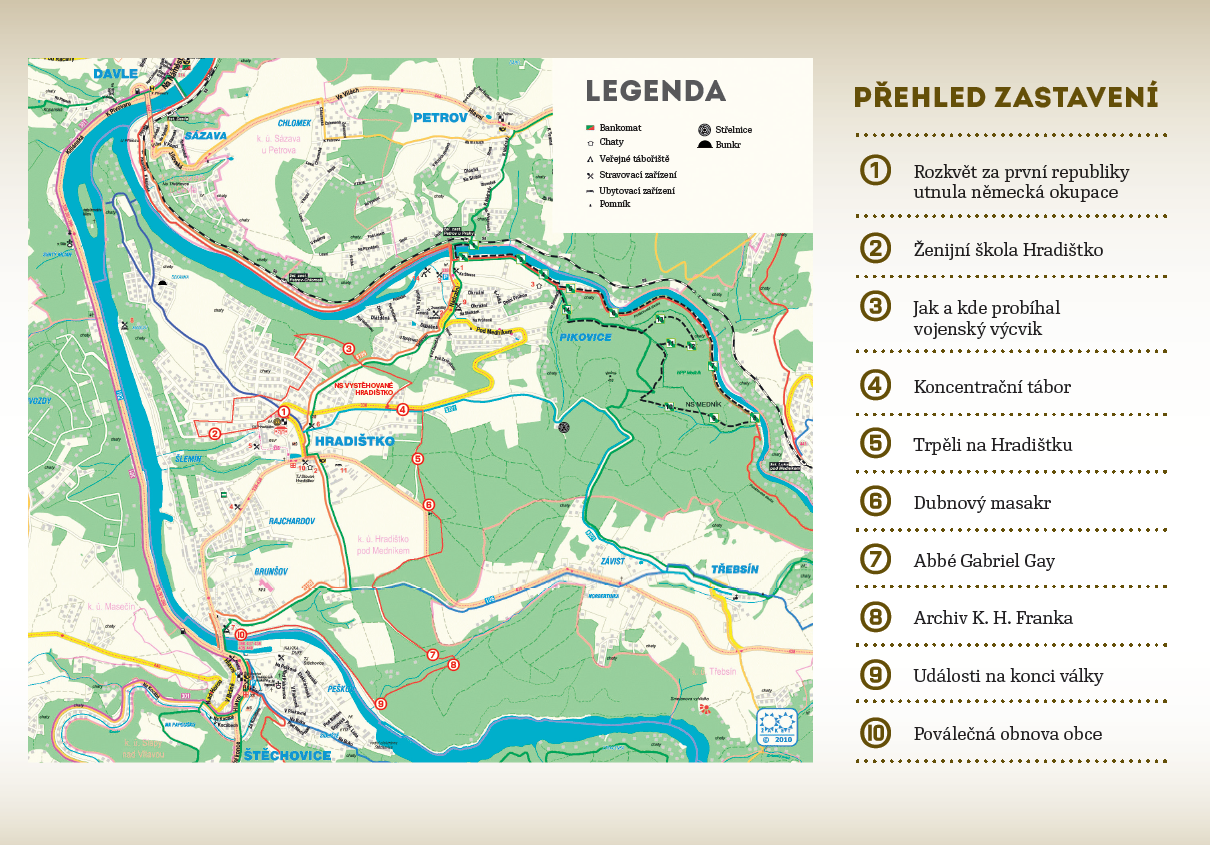 Návštěvníky seznámuje s historií násilného vystěhování obce za druhé světové války a budování vojenského cvičiště zbraní SS, přibližuje hrůzy života v koncentračním táboře a připomíná osudy několika vězňů. Jedním z témat je i vyzvednutí archivu K. H. Franka v únoru 1946 Američany. Závěr stezky je věnován událostem na samém konci války a poválečné obnově obce. Autorkou stezky je Lucie Hašková.