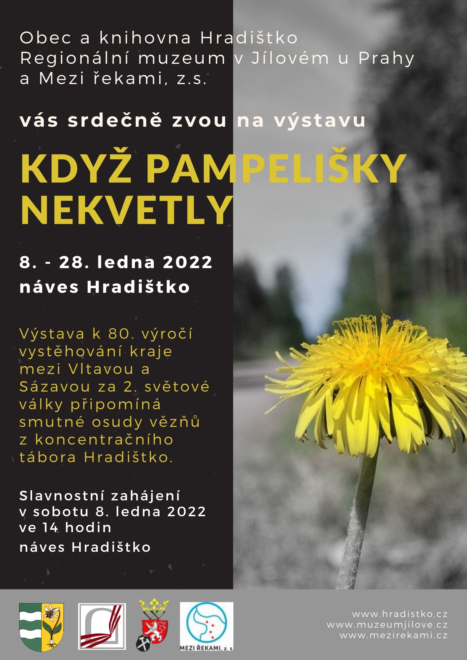 Srdečně vás zveme na výstavu “Když pampelišky nekvetly”, která se koná u příležitosti 80. výročí vystěhování kraje mezi Vltavou a Sázavou za 2. světové války. Výstava připomíná smutné příběhy vězňů z koncentračního tábora Hradištko a bude přístupná od 8. do 28. ledna 2022 na návsi u zámku. Slavnostní zahájení proběhne v sobotu 8. ledna 2022 od 14 hodin. Součástí programu bude promítání francouzského dokumentu o osudech deportovaných v obřadní síni na zámku. Plakát zde.
